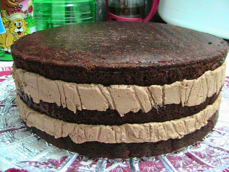 Am mixat ouale impreuna cu zaharul aprox 30 de minute. Cu telul am incorporate faina si cacao putin cate putin. Am pus compozitia in tava (diametru 22 cm) tapetata cu hartie de copt.